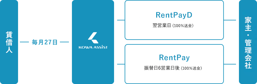弊社にて補填(代位弁済)し、賃料全額を指定の口座に一括送金するサービスです。